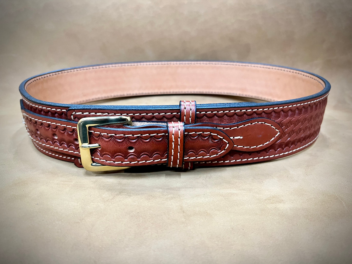 Our River Belts are made of 14 oz construction with a 7 oz leather outer and inner layer for the solid leather options and a 10 oz leather layer with a synthetic layer for the rest of the options.